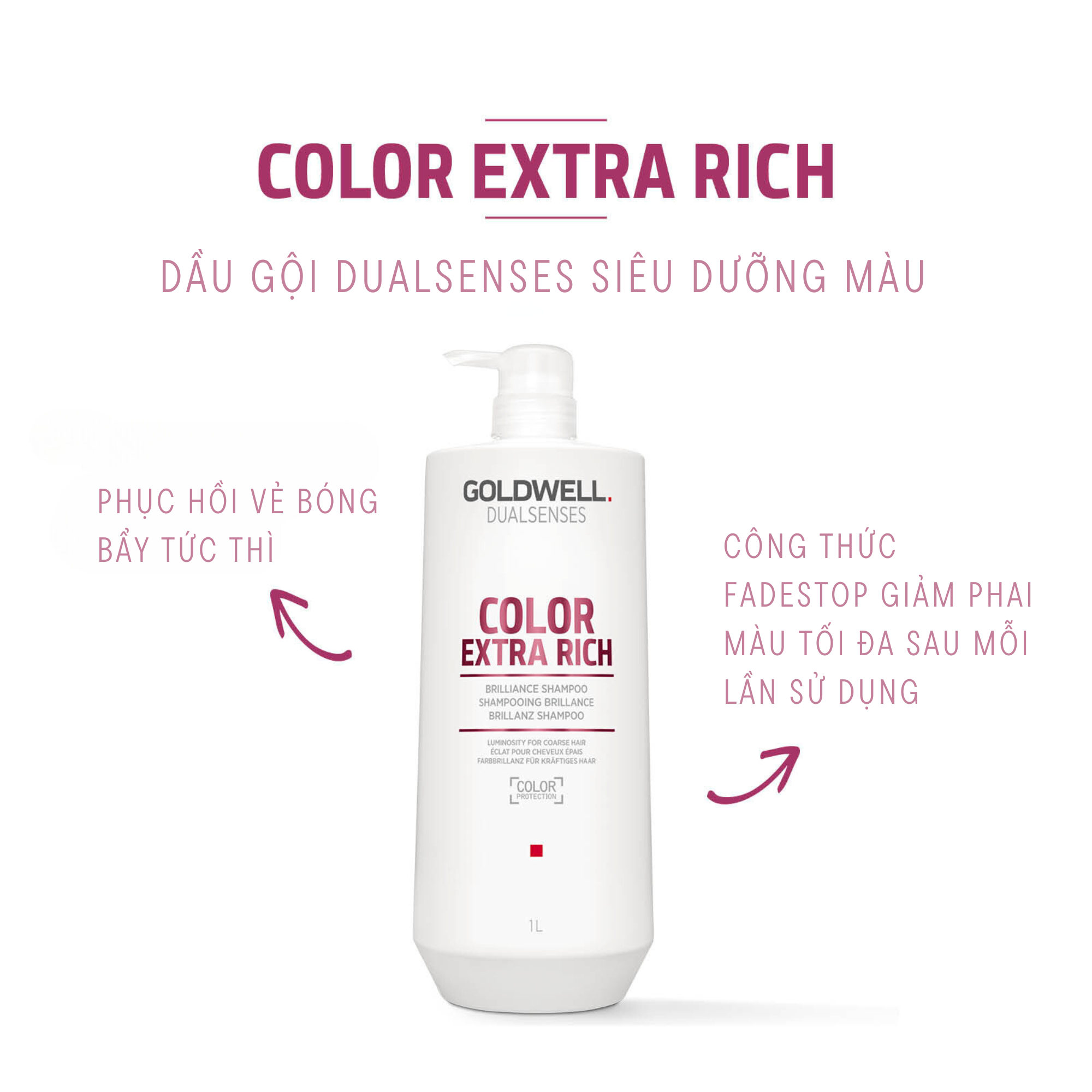 - Với công thức FadeStop dịu nhẹ như nước, dầu gội Goldwell Color Extra Rich giúp giảm phai màu tối đa trong mỗi lần sử dụng.
