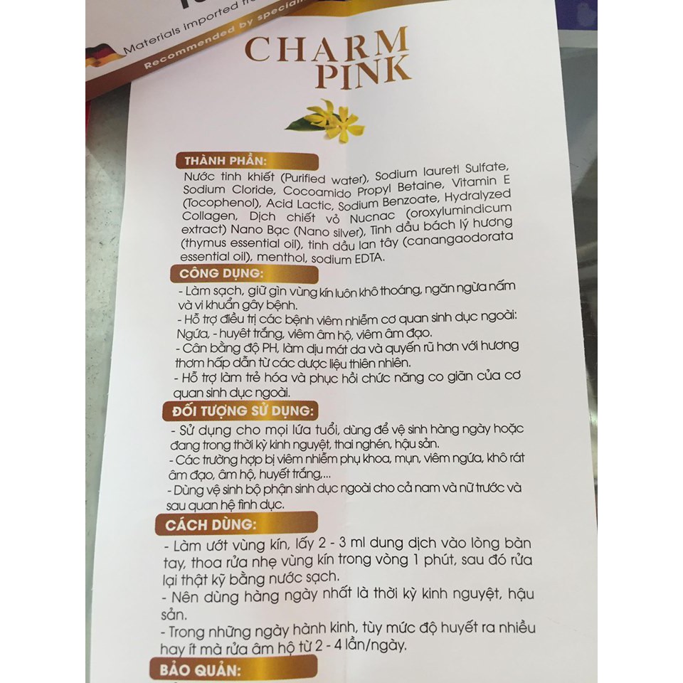 Giới thiệu Dung dịch vệ sinh phụ nữ CHARM PINK 180ml- Nguyên liệu Đức