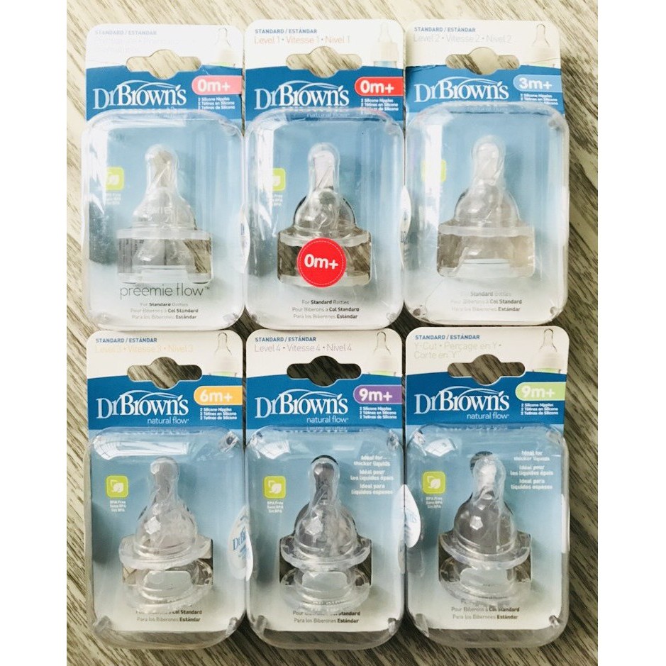 Hiểu được nhu cầu ở từng giai đoạn phát triển ngắn ngủi của bé, tiến sĩ Dr.Brown's cùng các đồng nghiệp cũng đã cho ra đời hệ thống Núm vú thay thế bình sữa Dr.Brown 's với 6 kích cỡ / 6 level như sau: