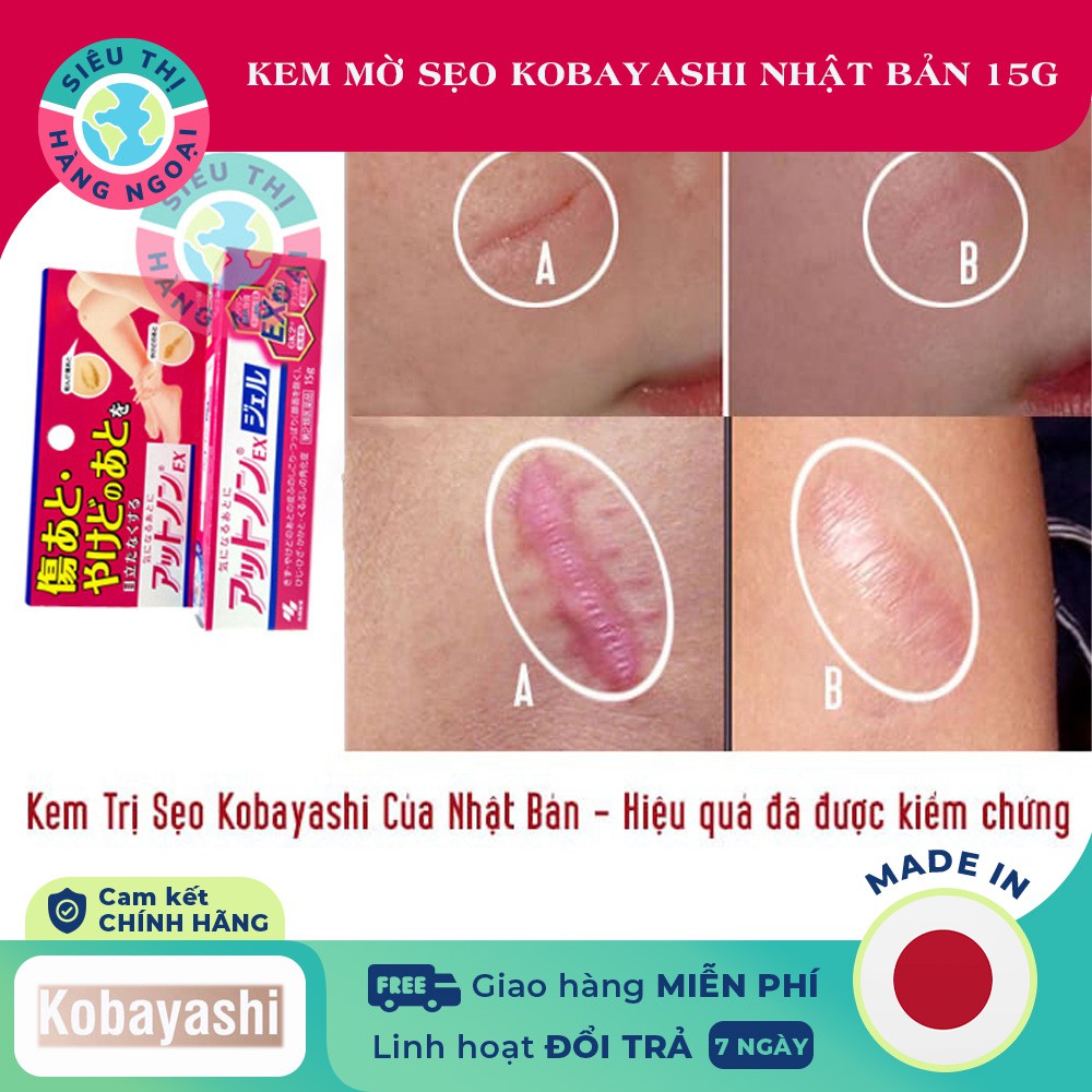- Kem mờ sẹo Kobayashi từ Nhật Bản giúp ngăn ngừa và làm mờ sẹo sau phẫu thuật, sẹo bỏng, thu nhỏ các vết sẹo cũ, sẹo thâm, sẹo phì đại.