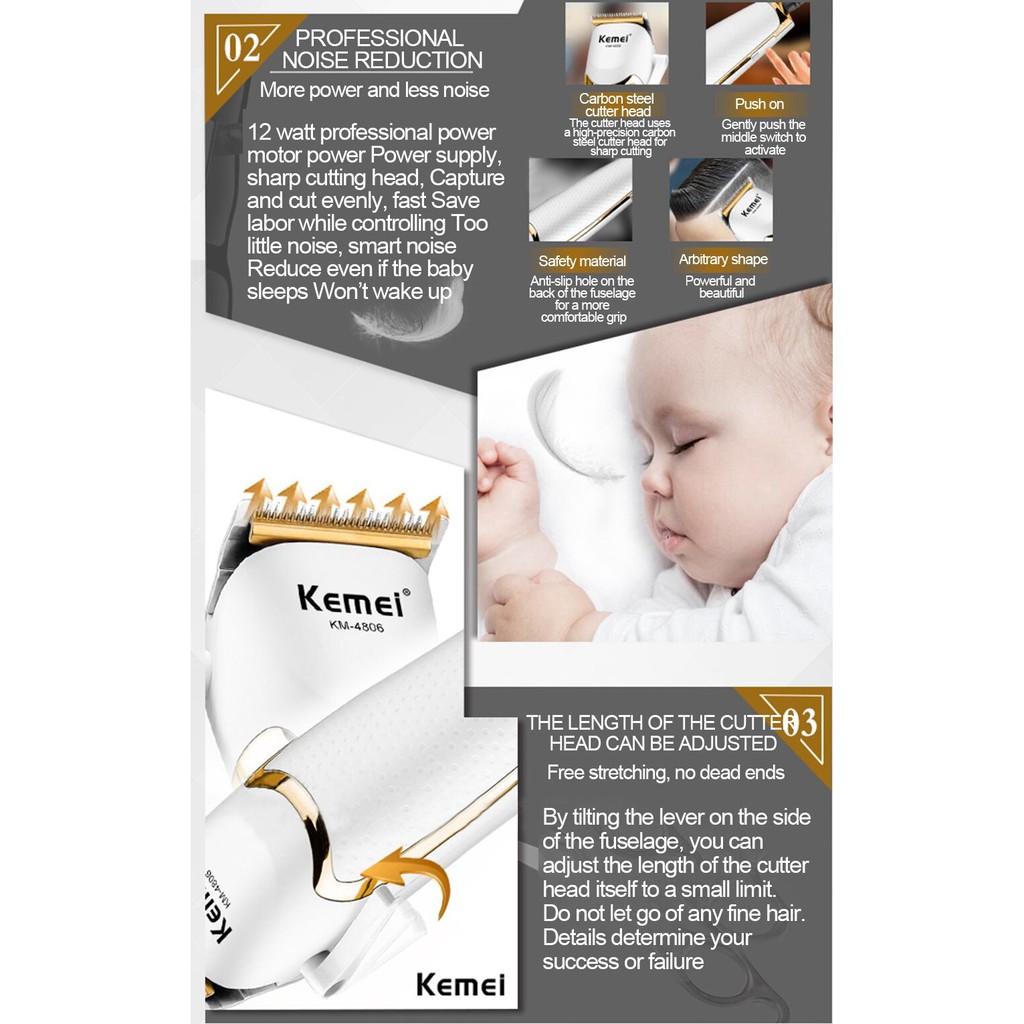 * Với vỏ ngoài tông đơ Kemei điện bằng nhựa cứng chống va đập và lưỡi từ hợp kim thép yên tâm với độ bền của sản phẩm.