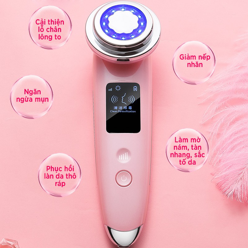- Cleansing and Detoxification(Rung Sonic+ánh sáng xanh): Hỗ trợ làm sạch da mặt, sâu lỗ chân lông. Kết hợp với bông tẩy trang