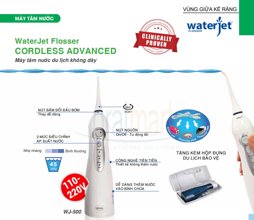 - WaterJet Flosser Cordless Advanced là máy tăm nước mạnh mẽ giúp loại bỏ các mảnh vụn sâu giữa răng và giảm nguy cơ vi khuẩn tích tụ trong các kẽ hở và bên dưới đường viền nướu. Có thể thêm vào một ít nước súc miệng để có cảm giác thơm. Máy có hiệu quả sử dụng rất tốt, đặc biệt là với những người có cầu và niềng răng.
