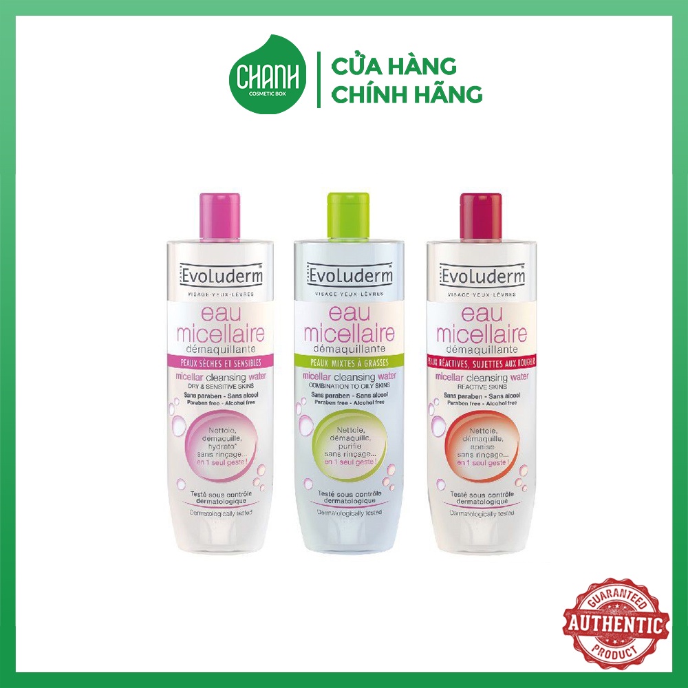 Nước tẩy trang - Evoluderm Micellar Cleasing Water là dòng sản phẩm tẩy trang thế hệ mới ứng dụng công nghệ Micellar Technology. Với công nghệ Micellar, Mixen là một nhóm các phân tử có đầu ưa nước và đuôi kị nước. Khi bôi lên da, các mixen mở ra, thu hút tất cả bụi bẩn, mảnh vỡ của lớp makeup bám trên da và mang nó ra đi. Điều vượt trội nhất của Micellar Water so với các dạng tẩy trang khác đó là nó tẩy trang được cả vùng mắt và môi (những vùng nhạy cảm), nước tẩy trang của Evoluderm KHÔNG DÙNG CỒN để làm sạch lấy đi cặn trang điểm mà ứng dụng cấu trúc phân tử có đầu ưa nước và đuôi kị nước để hút cặn trang điểm và bụi bẩn trong lỗ chân lông, Evoluderm Micellar Cleasing Water có ưu điểm là tẩy được mọi chỗ có make-up.