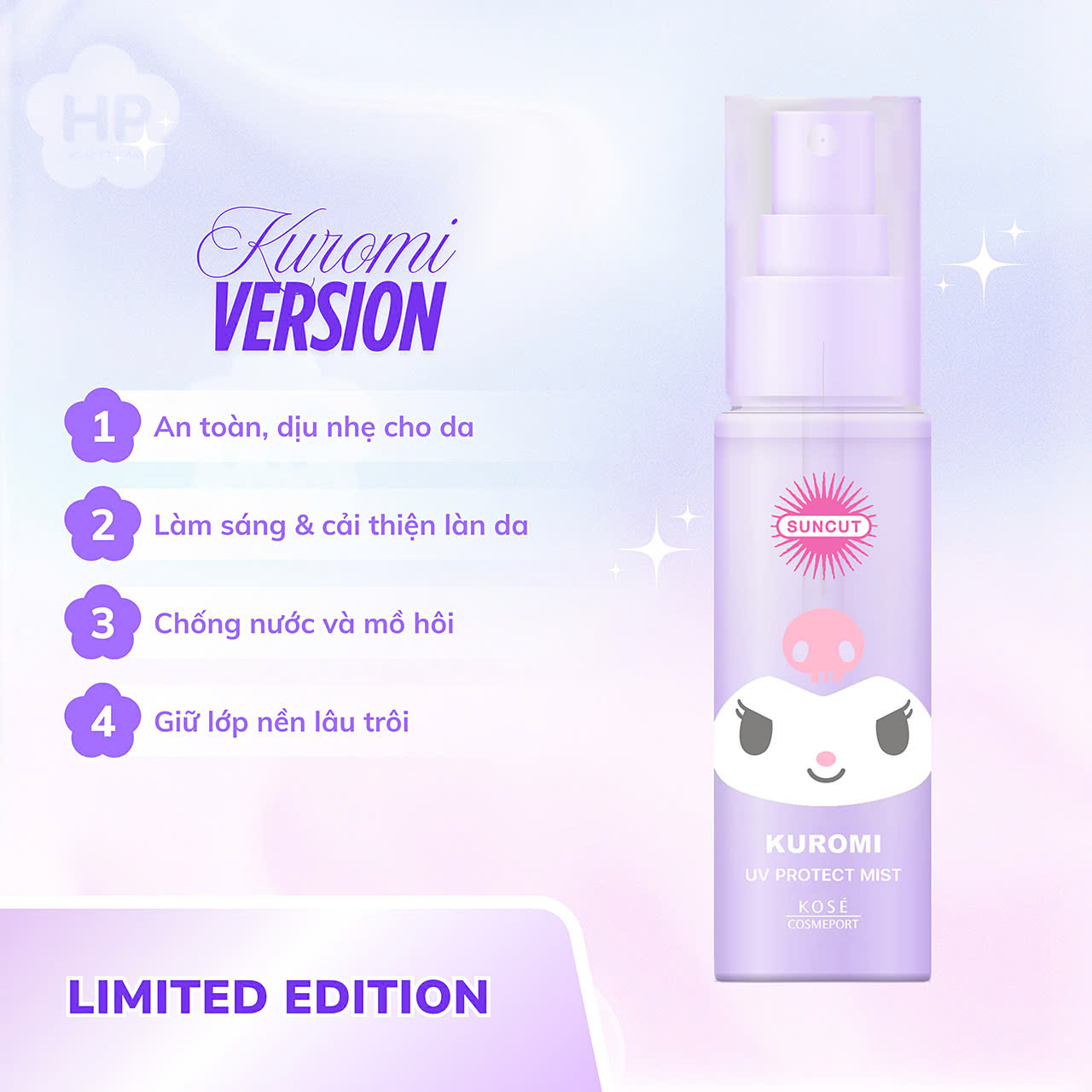 Công Dụng Xịt Chống Nắng Giúp Dưỡng Ẩm Và Bảo Vệ Da Kose Suncut Protect UV Mist N 60mL ( Bản Giới Hạn Kuromi ) : Sản phẩm xịt chống nắng, giúp bảo vệ da trước ánh nắng mặt trời, hỗ trợ dưỡng ẩm da, cho da luôn mịn màng.